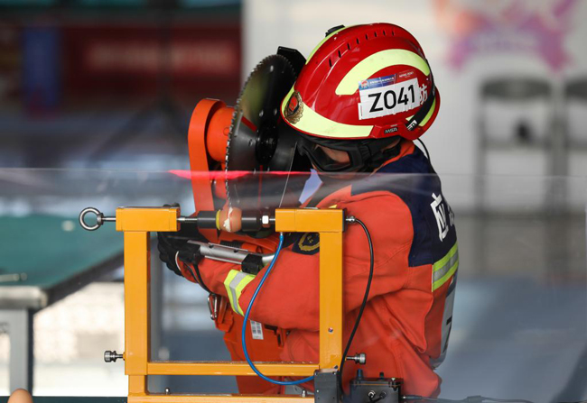 2021年10月28日,全国消防行业职业技能大赛决赛在南京举行,参赛选手在比赛使用电锯剥鸡蛋壳。新华社发(刘浏 摄)