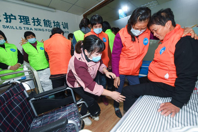 2021年10月21日,浙江省杭州市临安区养老护理员培训基地的老师(前排右三)给养老护理员及党员志愿者开展养老护理专业技能培训。 新华社记者 徐昱 摄