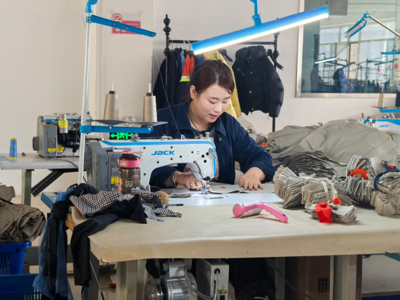 缝纫机声哒哒作响,32岁的张小梅和工友们端坐工位上,指尖翻飞、走线流畅,专注地进行着裁缝缝制工作。
