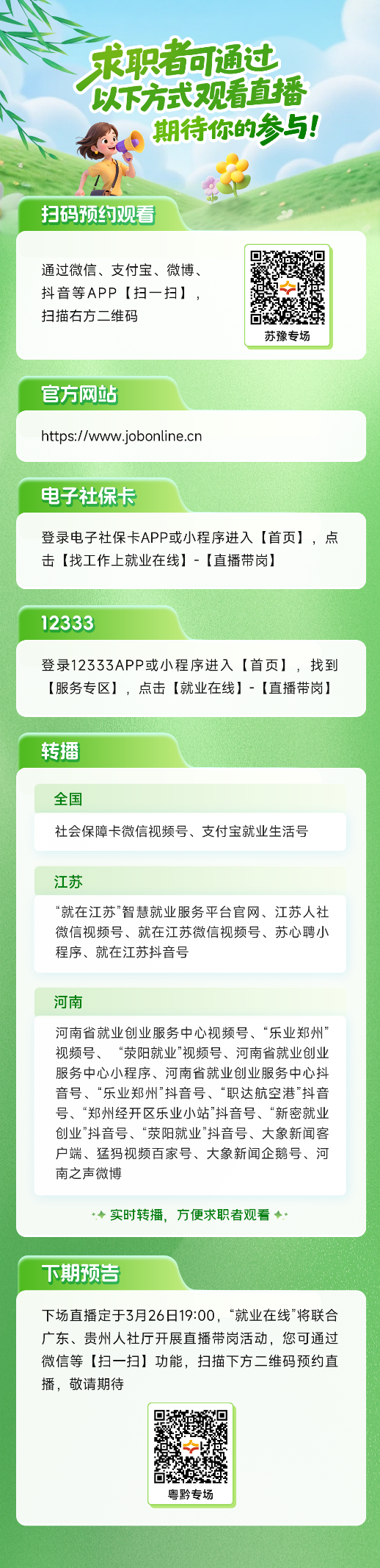 “春风送岗促就业 真情相助暖民心”,2026年春风行动火热进行中,“就业在线”平台开展春风行动暨就业援助季跨省劳务对接系列直播带岗活动。3月19日19:00,“就业在线”平台携手江苏省、河南省人力资源社会保障厅开展春风行动暨就业援助季跨省劳务对接苏豫专场直播,为您带来权威政策解读,优质岗位推介,专业求职指导,助力广大求职者就业。