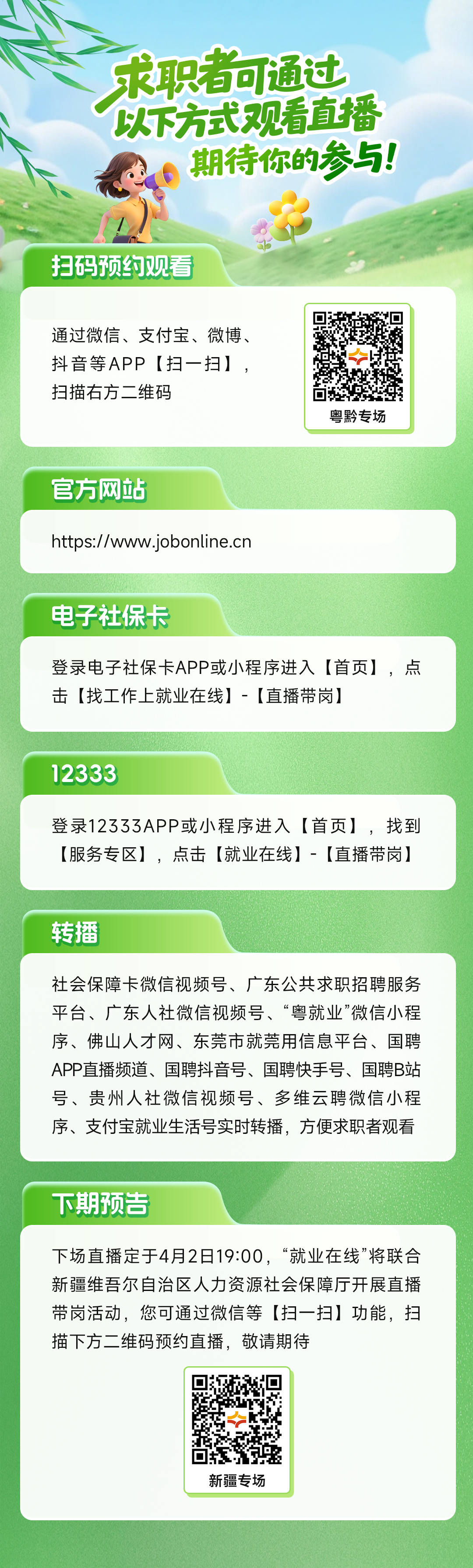 “春风送岗促就业 真情相助暖民心”,2026年春风行动火热进行中,“就业在线”平台开展春风行动暨就业援助季跨省劳务对接系列直播带岗活动。3月26日19:00,“就业在线”平台携手广东省、贵州省人力资源社会保障厅开展春风行动暨就业援助季跨省劳务对接粤黔专场直播,为您带来权威政策解读,优质岗位推介,专业求职指导,助力广大求职者就业。