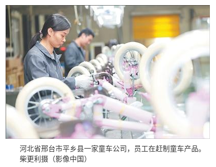 平乡县有5200多家自行车童车上下游企业,年营收超300亿元。发挥产业优势,“平乡童车人”劳务品牌已涵盖童车设计、制造、组装等百余个工种,吸纳就业超过12万人,包括脱贫劳动力上千人。