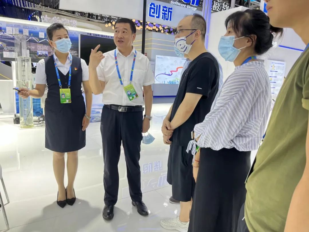 宁夏人社厅信息数据管理中心主任花自荣(左二)为观展群众现场讲解。宁夏人力资源和社会保障厅供图