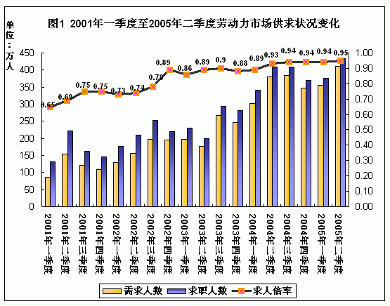 下图1显示了2001年一季度以来劳动力市场职业供求状况变化情况。