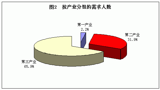 二季度104个城市第一、二、三产业需求人数所占比重依次为2.2%、31.9%和65.9%。从总量结构看,第三产业的用人需求依然占主体地位。