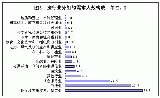 从行业需求看,各行业的用人需求主要集中在批发和零售贸易、餐饮业,制造业和社会服务业三大行业,其用人需求分别为29.9%、25.5%和17.4%,三者合计约占各行业总需求的72.8%。