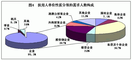 3.从用人单位看,企业用人占主体地位,其中,57.4%的用人需求集中在私营及个体企业、股份制企业。
