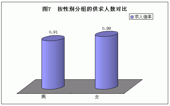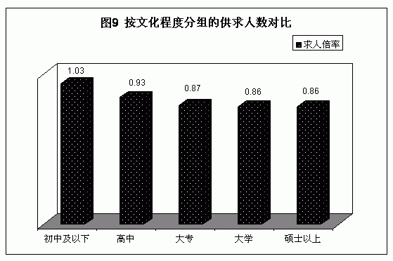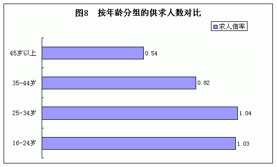 6.分性别,女性的求人倍率略高于男性;分年龄组,16–24岁、25–34岁年龄组的求人倍率高于其他年龄组,其求人倍率分别为1.03、1.04; 45岁以上年龄组的求人倍率最低,仅为0.54;按文化程度分组,初中及以下文化程度、高中、大专、大学、硕士以上各文化程度的求人倍率分别为1.03、0.93、0.87、0.86和0.86。