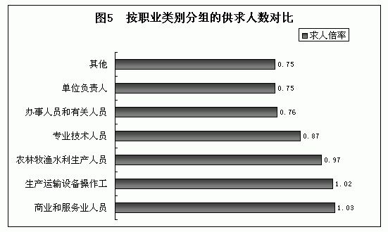 4.商业和服务业人员、生产运输设备操作工既是用人需求的主体,又是求职人员集中求聘的职业。从供求状况对比来看,商业和服务业人员、生产运输设备操作工、专业技术人员的求人倍率分别为1.03、1.02和0.87。