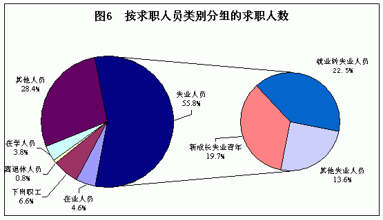 5.在所有求职人员中,失业人员所占比重高达55.8%。求职人员中就业转失业人员和其他人员(主要是进城市务工人员)的比重呈下降态势, 而新成长失业人员、下岗职工的比重则呈现上升态势。