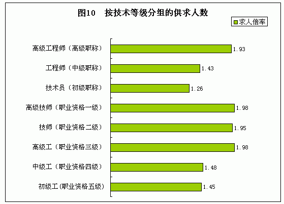 7.各技术等级的求人倍率均大于1,劳动力需求大于供给。其中,求人倍率较大的是高级技师、高级工、技师和高级工程师,其求人倍率分别为1.98、1.98、1.95和1.93。