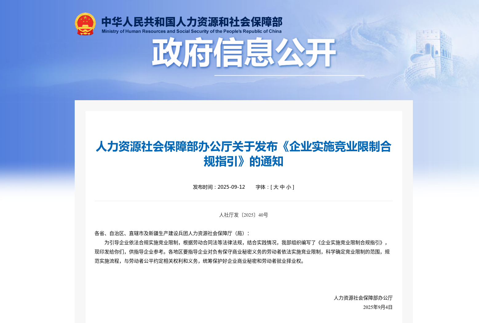 嘉 宾:近日,人力资源社会保障部办公厅印发了《企业实施竞业限制合规指引》(以下简称《指引》)。人力资源社会保障部劳动关系司负责同志就相关问题作政策解读。
